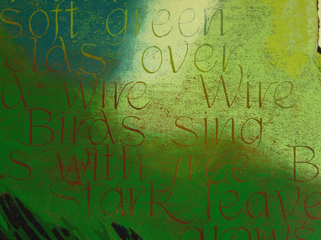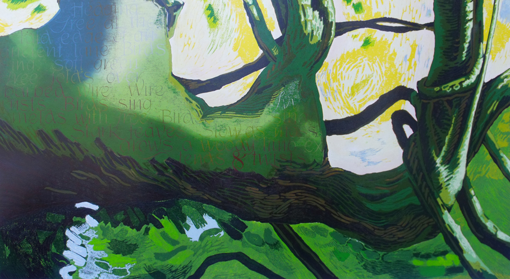 The following prints consider ideas generated by walking along a green lane and seeing the constricted and distorted growth of an ancient laid hedge there; now abandoned, it’s limbs entangled and covered in mosses. Sumptuous greens and dappled sunlight falling on elegant lettering.