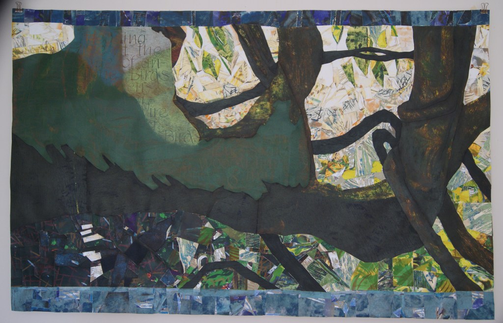 Method: Collage, using archival glue and redundant prints. Size: w 126 x h 81 cms.