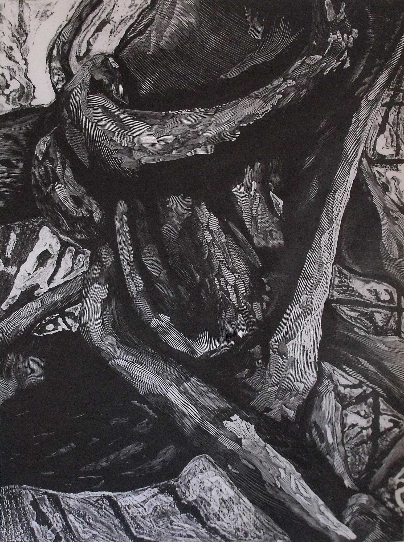 Method: Linocut with caustic Etch – Hand Burnished. Size: w 62 x h 92 cms. Edition size: 30.