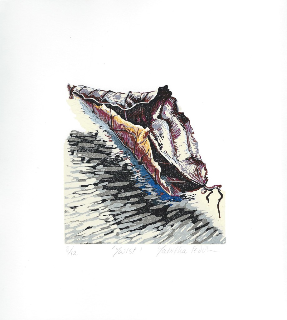 Method: Reduction Linocut – Hand Burnished. Size: w 25 x h 20 cms. Edition size 15.
