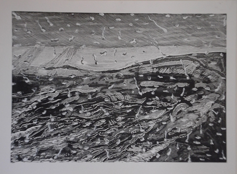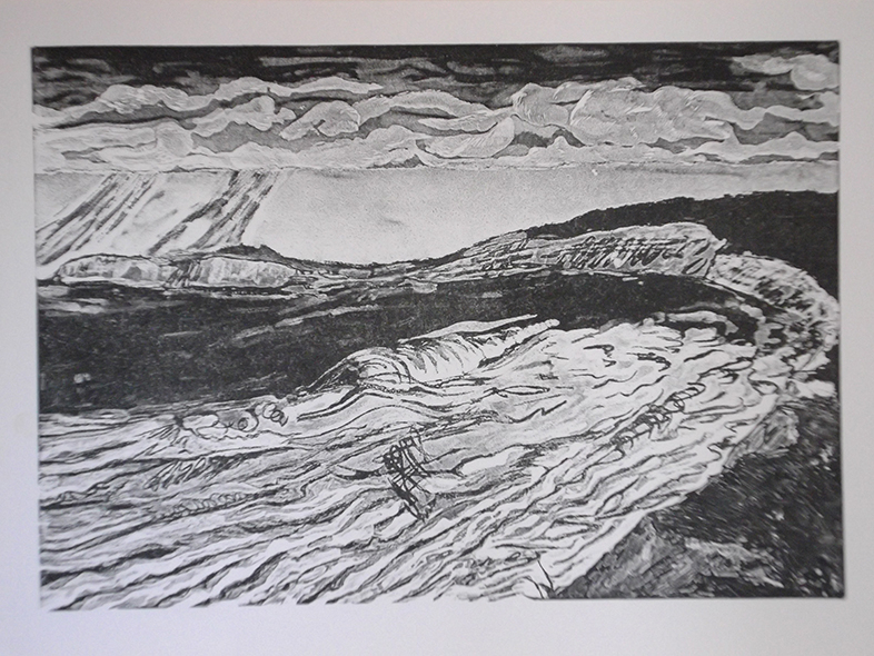 Method: Linocut & Caustic Etch. Size: w 63 x h 45 cms. Edition size: 40.