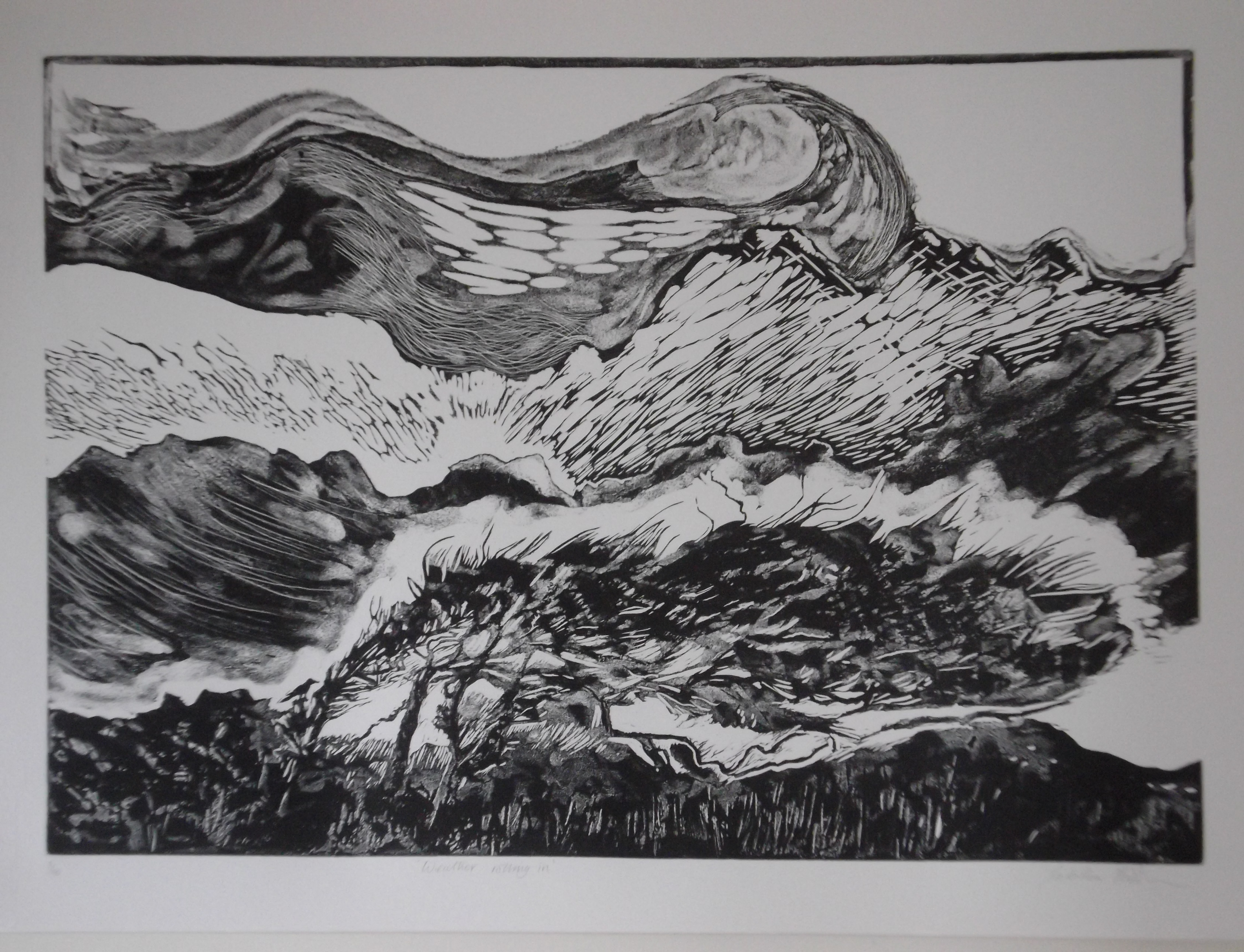 Method: Linocut & Caustic Etch. Size: w 63 x h 45 cms. Edition size: 20.