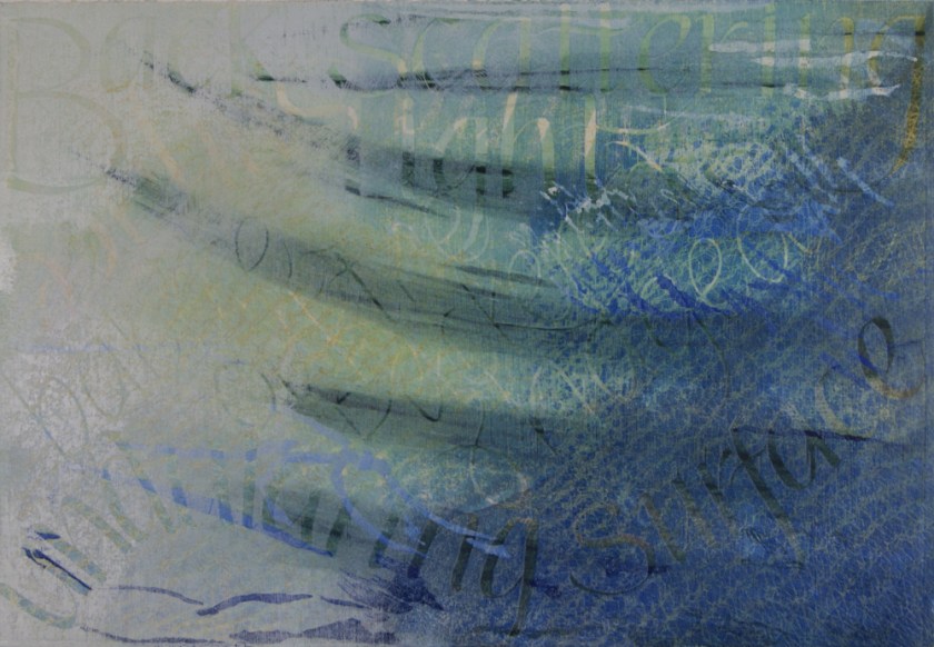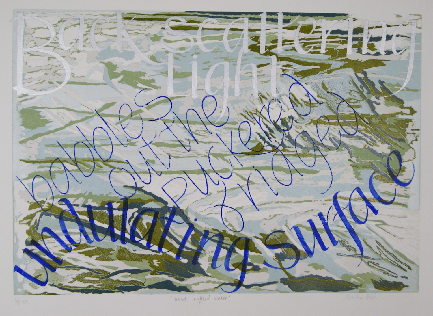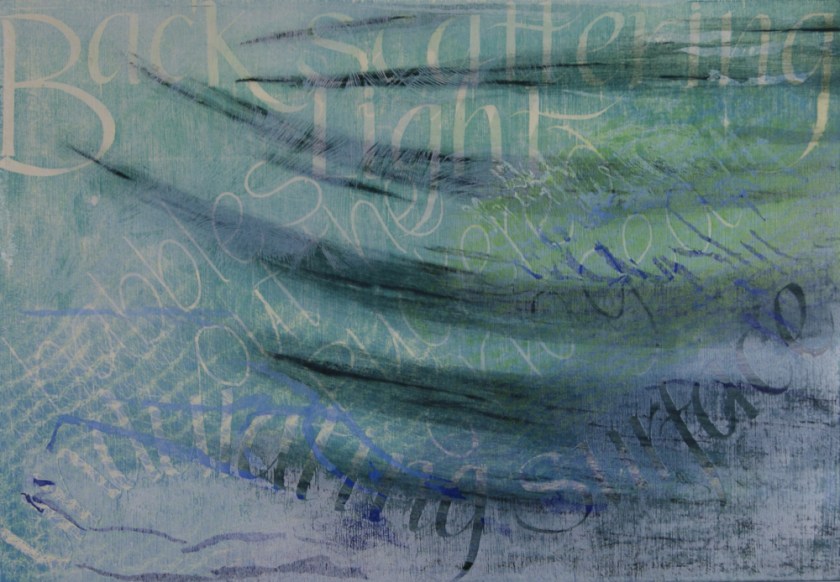 ‘Wind Ruffled Water’ and ‘Back Scattering Light’ are complex studio prints, developed from memory and simple in-situ sketches. This distance from the subject matter has enabled me to play with my longstanding interest in Fine Lettering alongside depth and surface texture.