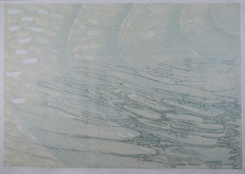 The print ‘Confluence’ uses traditional reduction printing techniques, Woodcut on one side of the paper and Linocut on the other. It is printed on fine tissue paper this allows glimpses from each image to be seen through the paper either side, adding to the maelstrom effect of currents and ripples caused by wind on the water surface.